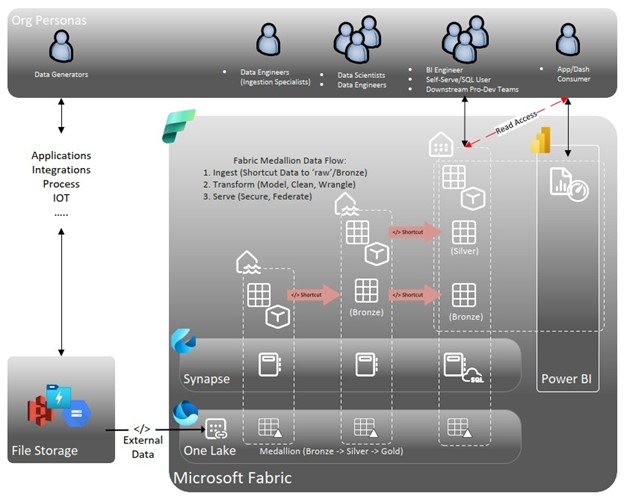 Beyond the ability to simplify the ingestion into the Fabric ecosystem, an even bigger gain through shortcuts can be achieved by applying them in tandem with medallion architecture to create an elegant stream of data flowing across the organization in a way that wouldn’t have been practical previously simply due to data storage costs and unnecessarily replication in the multiple layers.